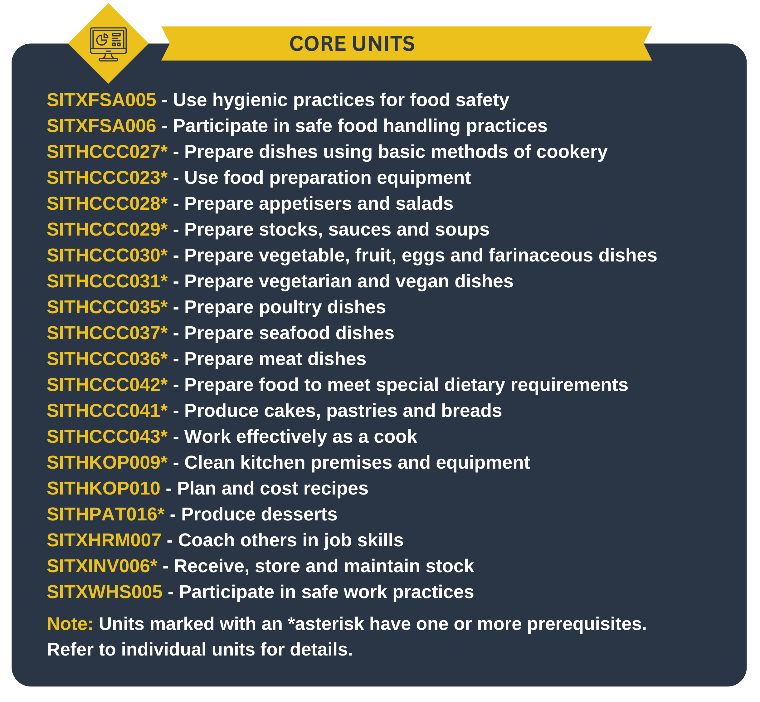 This qualification reflects the role of cooks who use a wide range of well-developed cookery skills and sound knowledge of kitchen operations to prepare food and menu items. Using discretion and judgement, they work with some independence and under limited supervision using plans, policies and procedures to guide work activities. Completion of this qualification contributes to recognition as a trade cook. This qualification provides a pathway to work as a cook in organisations such as restaurants, hotels, clubs, pubs, cafes, and coffee shops.